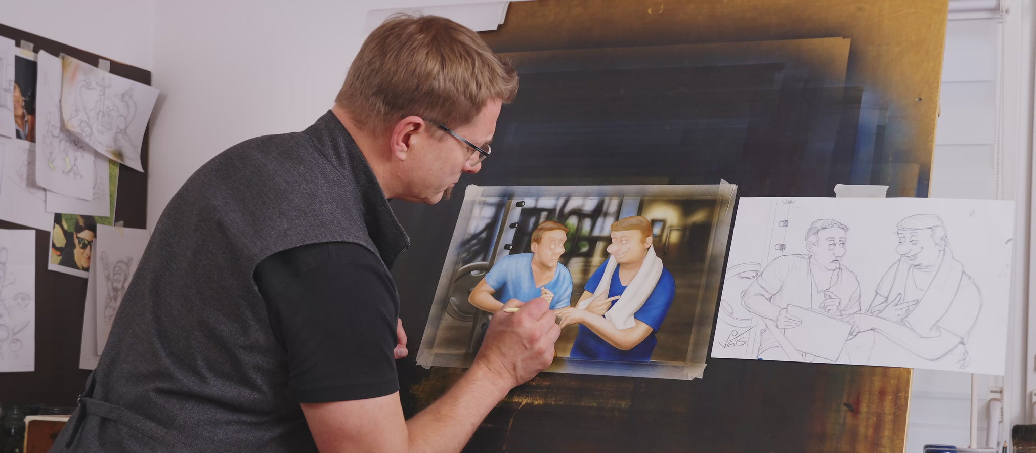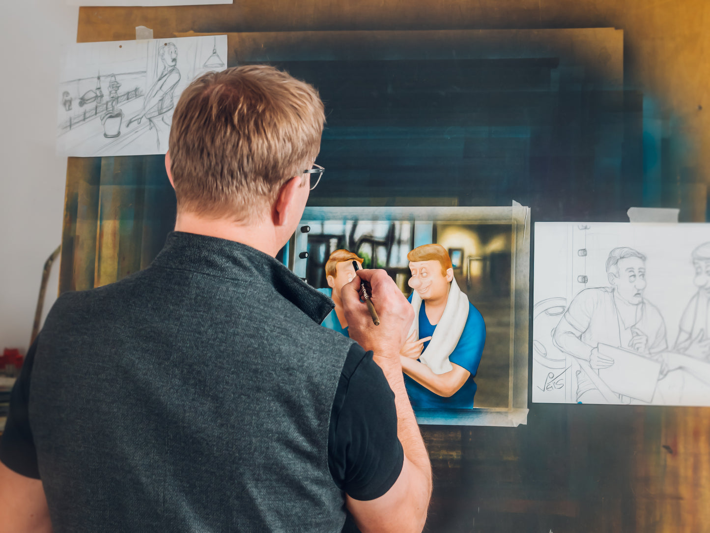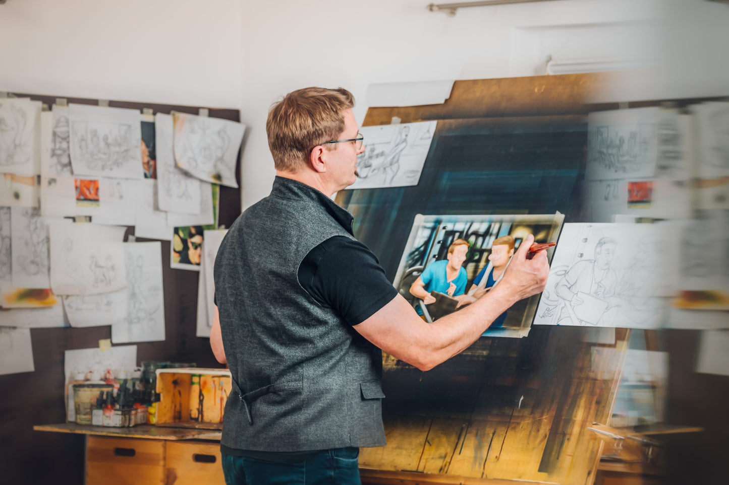 Mit Acrylfarben, Pinsel, Airbrush, Farbstiften, Bleistift und Radierer werden auf der Staffelei von Veit Schenderlein humorvolle