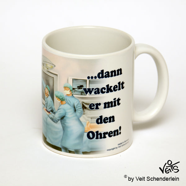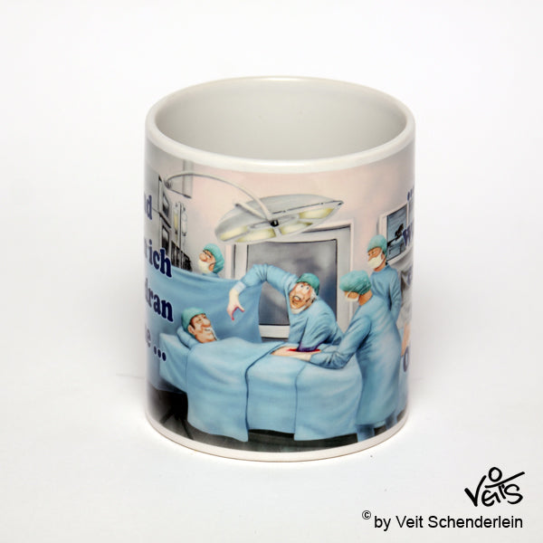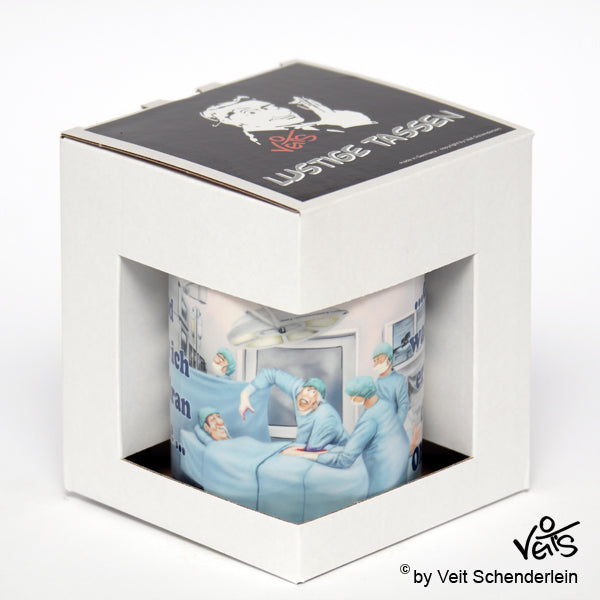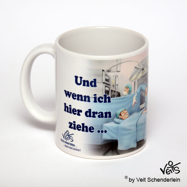 Veit`S - Tasse: OP - Wenn ich hier dran ziehe...! Keramik - weiß, Höhe ca. 95 mm, Durchmesser: ca. 80mm, Tasse und Druck Spülmaschinenfest, Tasse ist schön verpackt im original Veit`S - Geschenkkarton